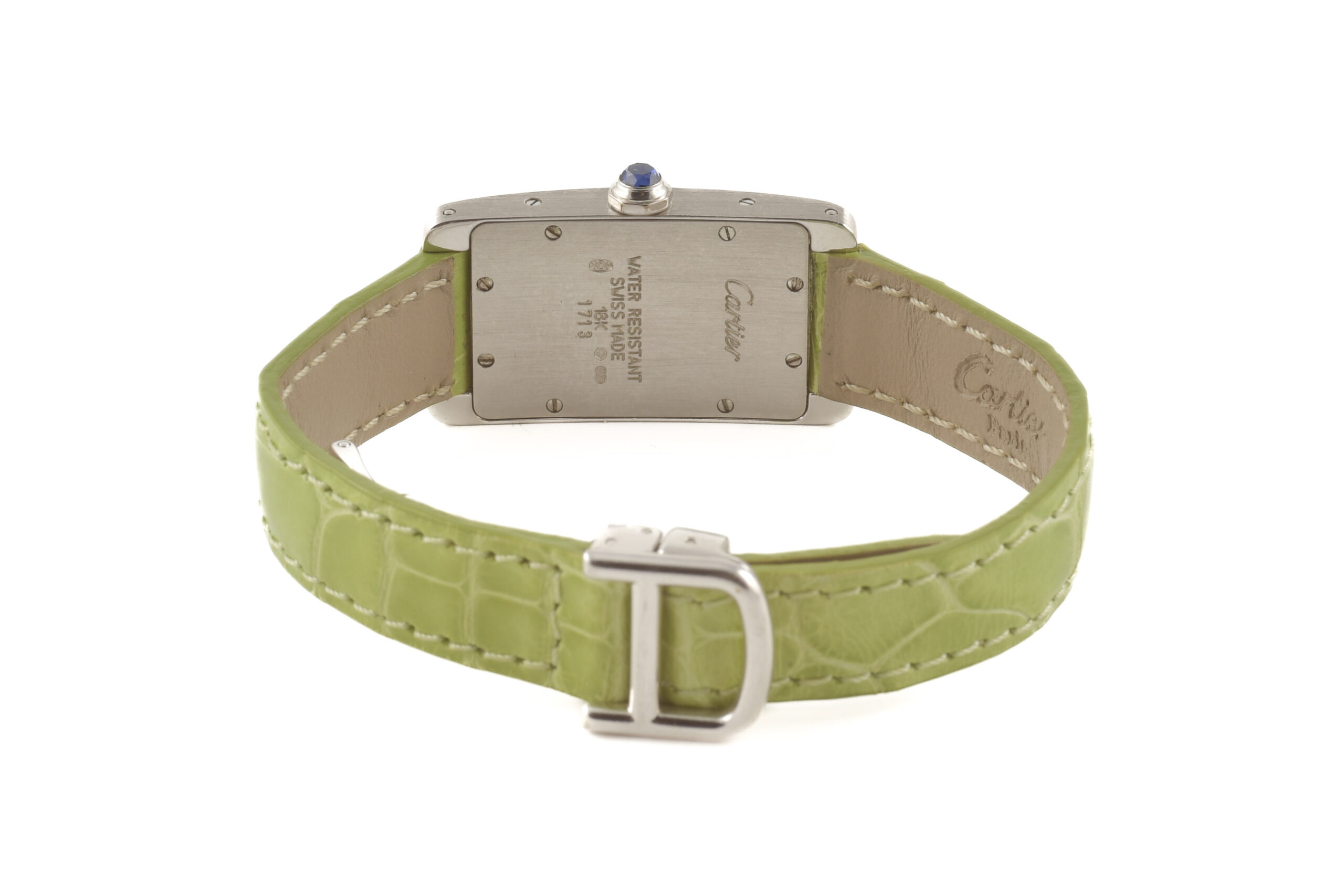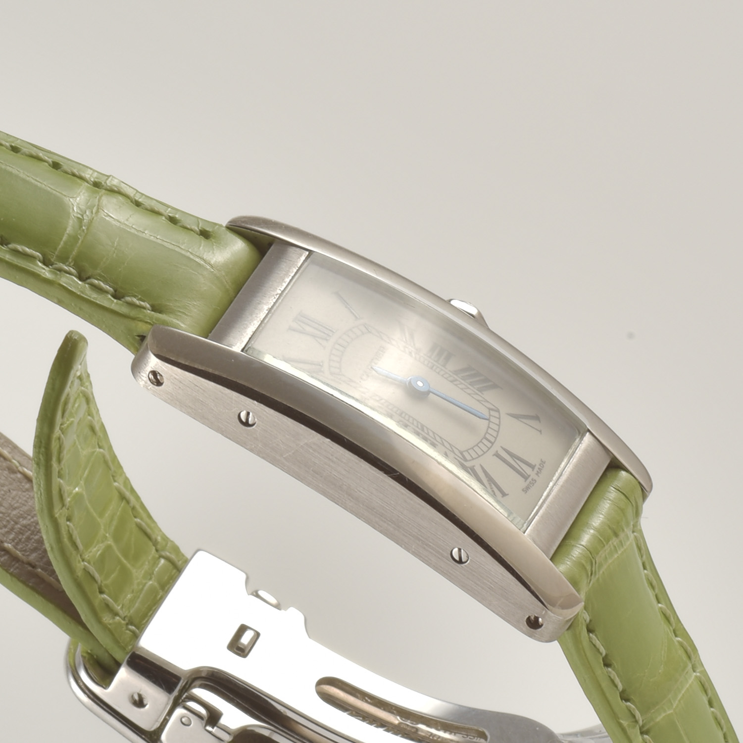 Cinturino in pelle verde con chiusura deployante in oro bianco 18k marcata Cartier