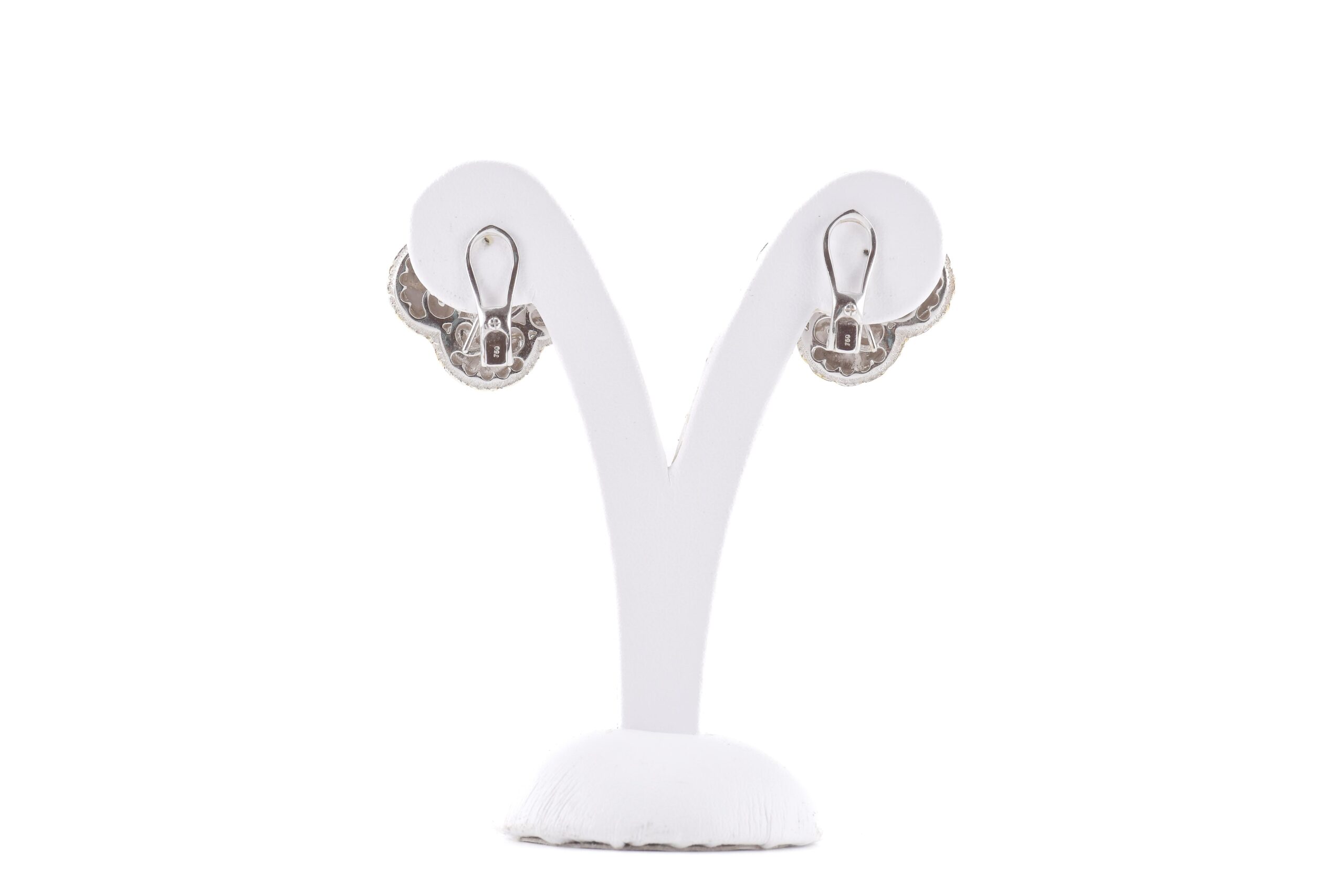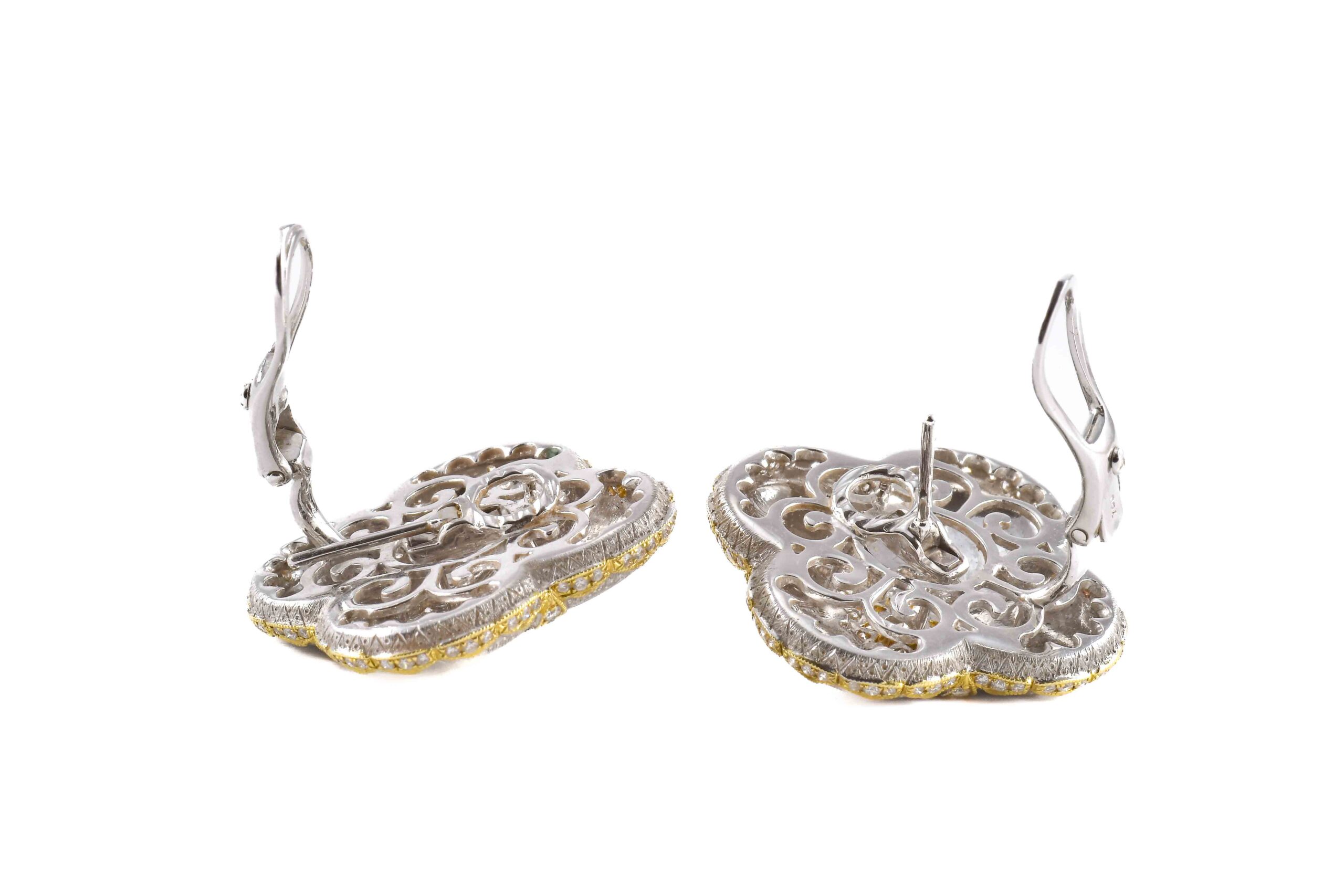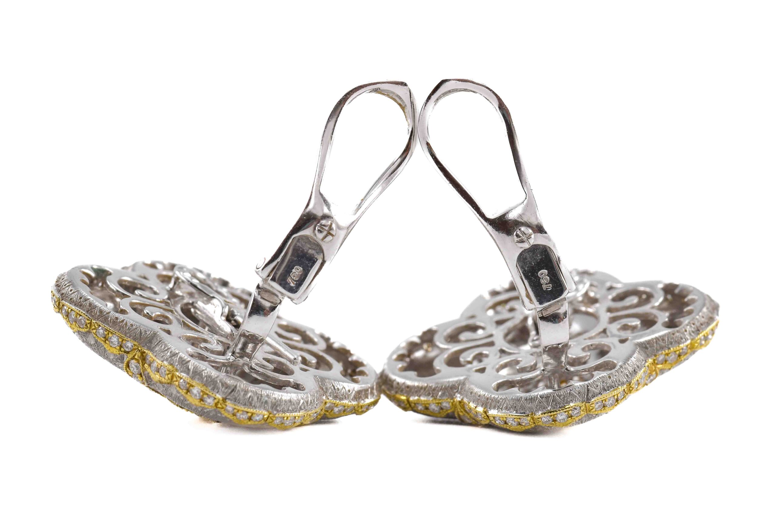 Paio di orecchini in oro bianco e giallo 18k (750/1000) con Diamanti taglio Brillante rotondo.